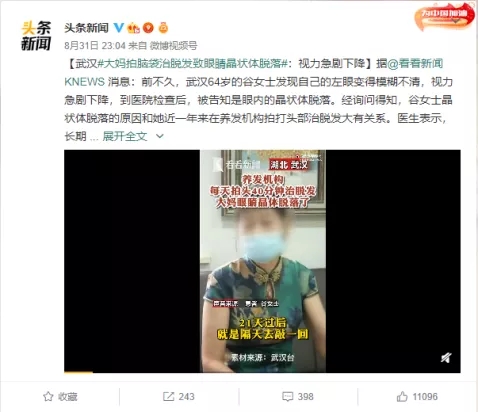 据相关新闻报道,武汉谷女士去了一个养发机构治脱发,每天被拍头40分钟乃至1个小时。过了一段时间后,她发现自己视力急剧下降,眼睛开始模糊,像罩了一层东西。去医院就诊,医生检查时发现,她的左眼晶体是完全脱位的。