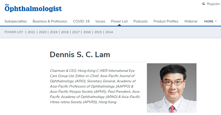 从2014年开始,《The Ophthalmologist 》每两年推出一次世界眼科人物最具影响力100强榜单,以表彰在眼科领域取得成就的杰出贡献者.而林顺潮教授于2014、2016、2018、2020、2022年连续五届被评选为"世界眼科人物100强",2018年更是中国唯一入选者.