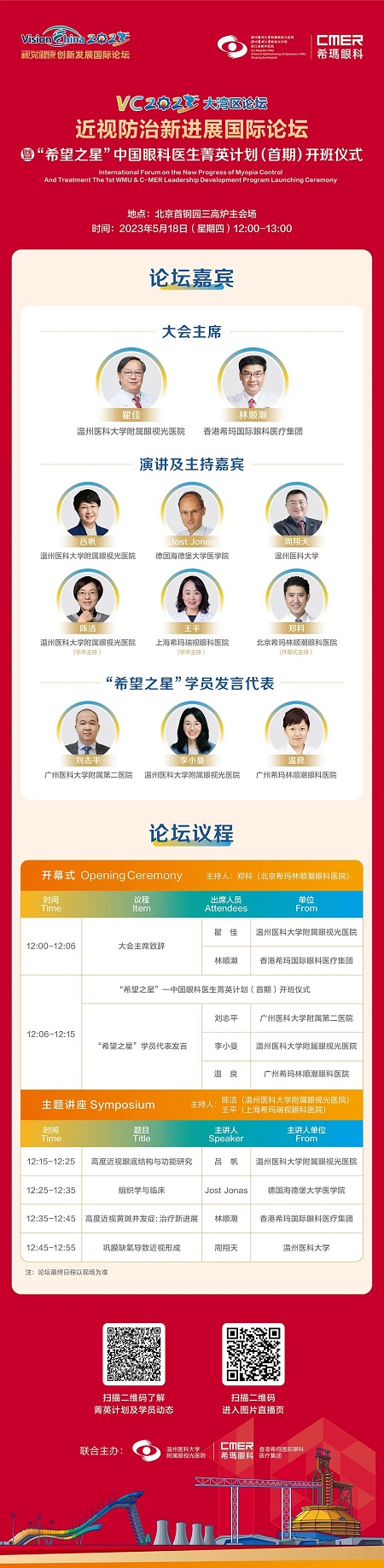 5月18日12:00,VC2023大湾区论坛——近视防治新进展国际论坛将由温州医科大学附属眼视光医院和香港希玛眼科集团联合举办,同期启动"希望之星"中国眼科医生菁英计划(首期)开班仪式.