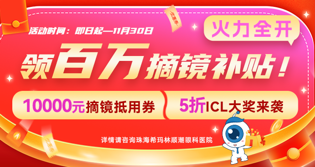 双11摘镜狂欢月·摘镜三重礼1、检查礼:11月到院享0元激光类全套术前检查,5折ICL全套术前检查优惠;2、预约礼:交定金享6000元/双眼近视手术优惠,11.11当天抽10000元摘镜优惠;11月至高可抽5折摘镜大礼!3、手术礼:11月完成手术并转发活动海报至朋友圈,瓜分10000元大奖!注:(以上活动内容完整内容,请咨询在线客服了解...