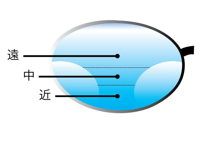 渐进式隐型眼镜是为老花而设计的隐形眼镜,有多种不同的设计,例如下图便是其中一种。镜片由中心环展至外围,渐进为三个部分调整视距,使双眼能适应不同的目标距离,令远、中、近距离的视物都清晰可见。