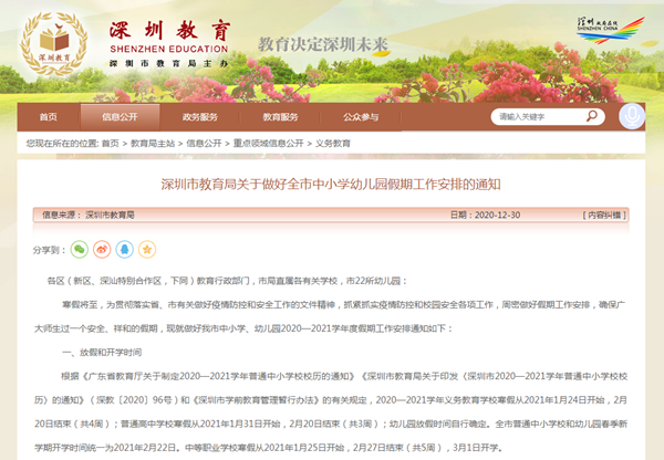 元旦过后,意味着寒假也就不远了,12月30日,深圳教育局官网发布了全市中小学幼儿园假期工作安排的通知,确定了不同年级的具体放假时间,都是在这个月的月底。