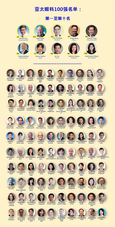 第1名:林顺潮(中国香港) - 世界眼科大会主席(2008)、亚太眼科学会前会长;第2名 :Hugh Taylor(澳大利亚) - 国际眼科委员会前会长、国际眼科科学院前副会长;第3名:Tien Yin Wong(新加坡) - 新加坡国家眼科研究中心前主任、清华大学医学院学科带头人;第4名:王宁利(中国) - 亚太眼科学会会长,中华医学会眼科学分会前任主任委员;第5名:谭智勇(中国香港) - 亚太眼科学会秘书长、亚太青光眼医学会候任会长;第6名:Charles McGhee(新西兰) - 亚太眼科科学院院长、亚太眼科学会前会长;第7名:Tetsuro Oshika(日本) - 世界眼科大会主席(2014) 、亚太眼科学会候任会长;第8名:姚克(中国) - 亚太白内障及屈光手术学会会长、中华医学会眼科学分会主任委员;第9名:Gemmy Cheung(新加坡) - 新加坡国家眼科研究中心教授、美国眼科学院区域顾问;第10名:Helen-Danesh Meyer(新西兰) - 新西兰奥克兰大学眼科教授、澳大利亚与新西兰皇家眼科学院女医生委员会主席.