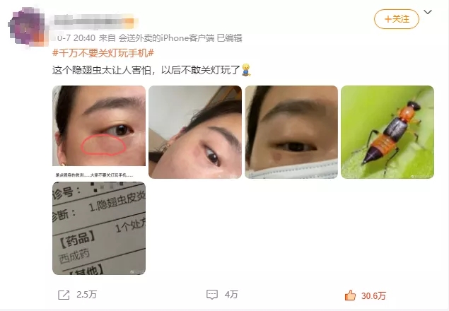 一女子关灯玩手机,黑暗中手机的亮光引来了隐翅虫,这种体内含有酸性毒液的虫子爬到她脸上,差点让她"毁容"!