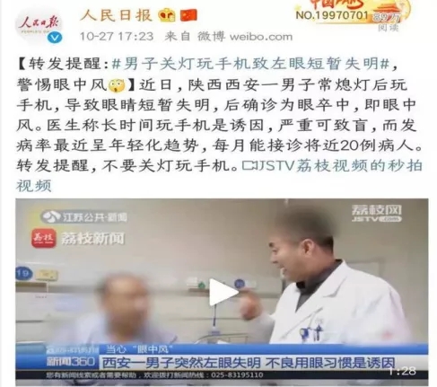 此前人民日报曾发布过一则新闻:男子关灯玩手机致左眼短暂失明,警惕眼中风!