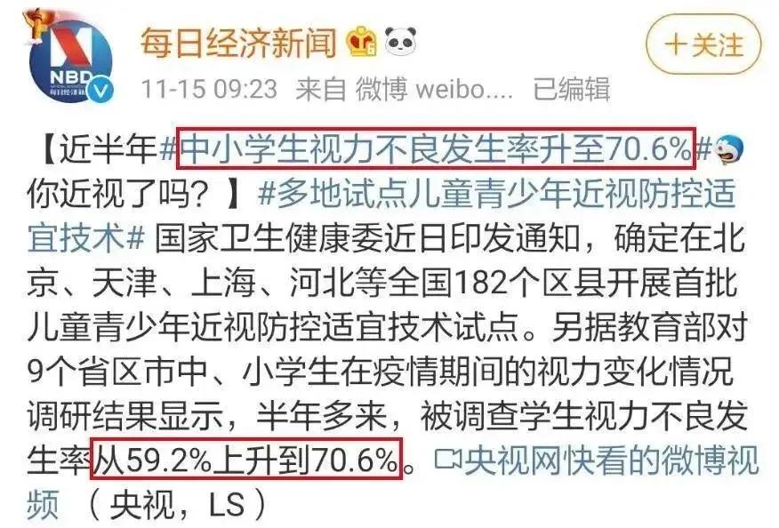 去年11月,教育部对9个省区市中、小学生在疫情期间的视力变化情况调研结果显示:半年多里,被调查学生视力不良发生率,从59.2%上升到70.6%!这就意味着,10个孩子中,就有7个是近视眼!