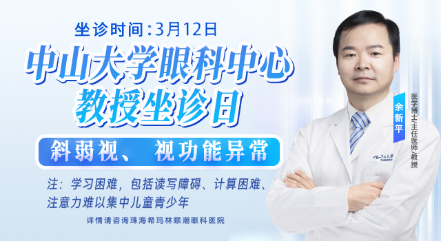 若孩子正经历着所提到的现象,3月12日(周日)中山大学中山眼科中心——余新平教授将在珠海希玛眼科出诊,为广大儿童青少年提供专业的小儿视力问题诊疗.